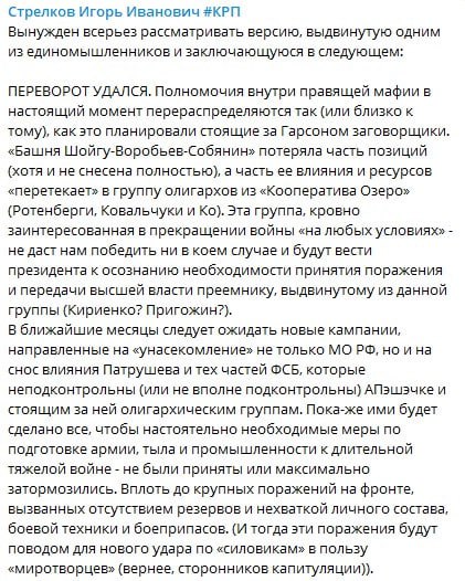 ИМХО, он готовит скрепцов к капитуляции, выставляя причиной "драку башен", а не силу ВСУ и народа Украины. Чтоб обидно не было, в т.ч.