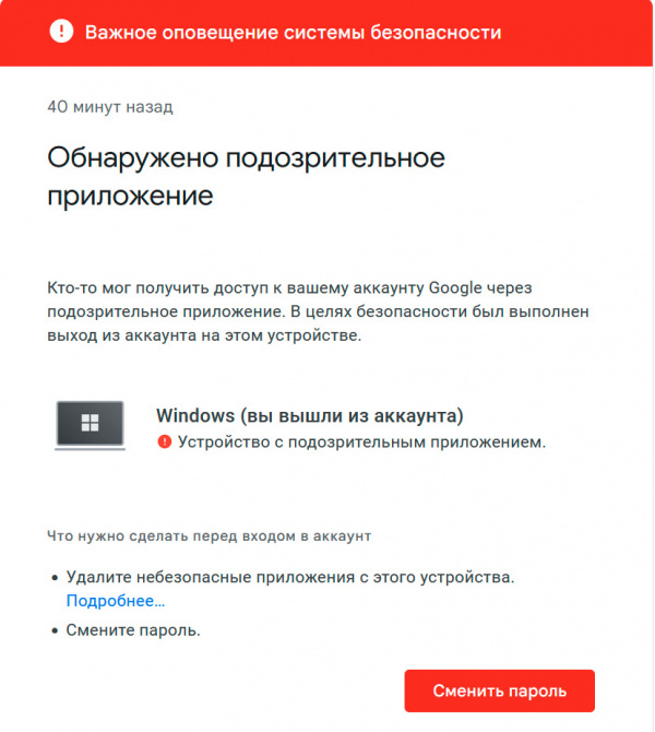 Гугл умеет поставить в тупик. Прислал оповещение системы безопасности. Подозрительное приложение Windows и больше ничего. Посмотрел, где я был залогинен в Windows - ну, в FireFox. И там логин сохранился. А больше нигде в Windows вроде и не был залогинен. И как это найти? И почему не указано само подозрительное приложение, если он из него разлогинил?