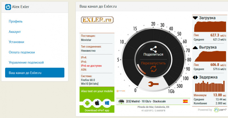 Для всех зарегистрированных пользователей в личном кабинете теперь доступна проверка скорости канала до Exler.ru.
