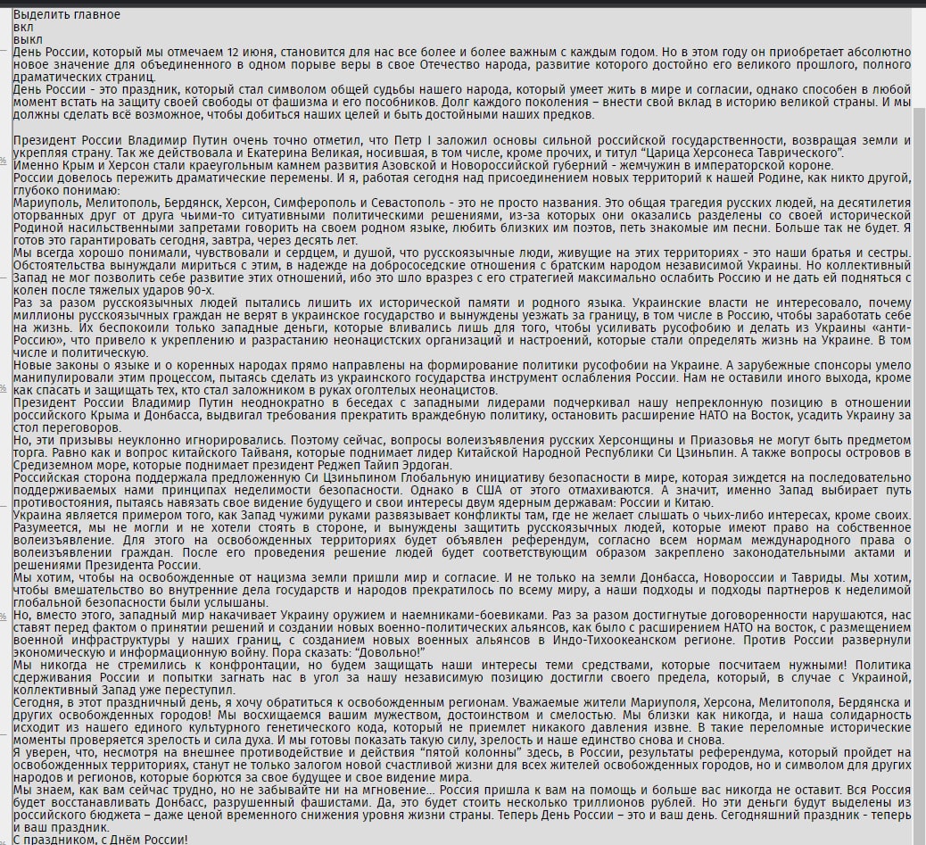 Офигеть. Первое впечатление, что Кириенко окончательно «съехал с катушек». Его обращение, появившееся утром на официальном сайте газеты «Известия» выдержано в абсолютно президентских интонациях. Такая риторика была бы уместна только рядом с физиономией путина в чёрной рамочке. Кажется, кириенко выигрывает подковерную битву за престол. Впрочем, любопытно в  этой энциклике обещание «потратить триллионы бюджетных средств» на восстановление Донбасса. Тут все понятно, тут песня «последний распил наступает». Публика сообразит, что марафетить развалины будут за ее счёт. Потом развалины все равно отберёт Украина. Не сомневаюсь, что из-за оглашения сумм «на восстановление», обращение кириенко провисит не долго. Скриншот есть. Невзоров. @nevzorovtv