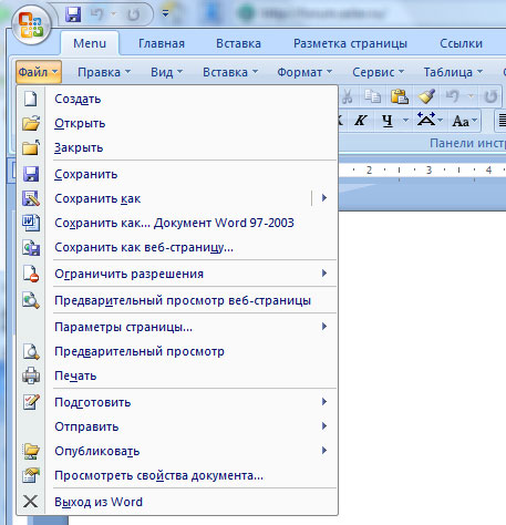 Обычные меню в Office 2007
