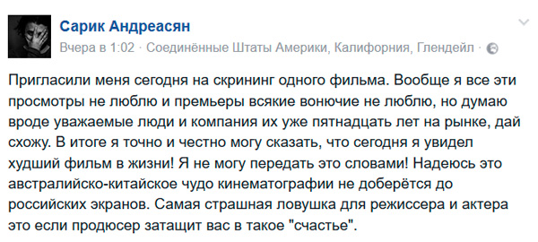 Куда эпичнее то, что Сарик "Нашответголливуду" Андреасян понял, что извне Голливуд не победить, и, видимо, внедряется, дабы разваливать систему одним только своим присутствием.