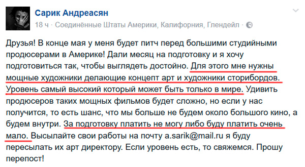 Объективности ради, "уровень самый высокий что может быть только в мире" - это Сарик не про художников, которых он хочет поиметь бесплатно, а про мериканьских продюсеров, которым он покажет бесплатные работы художников. Просто этот талантливый сценарист не очень точно выражает свои мысли. Но он явно растет творчески - восклицательный знак уже не в каждом первом предложении, как раньше )
