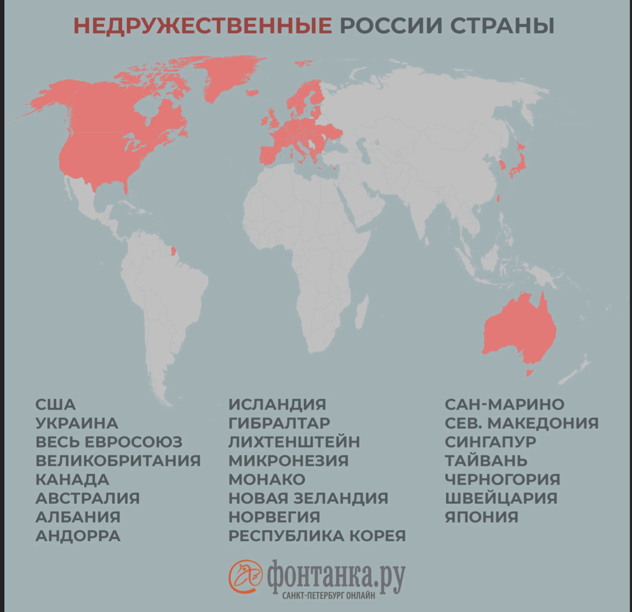 Еще пять стран добавили в список недружественных. По-моему, они как-то не с того конца начинают. Давно пора всех объявить недружественными (тем более что примерно так оно и есть), а вести список дружественных - Венесуэла, Эритрея и кто там еще? Работы просто будет значительно меньше. Зачем лишний раз напрягаться, правильно?