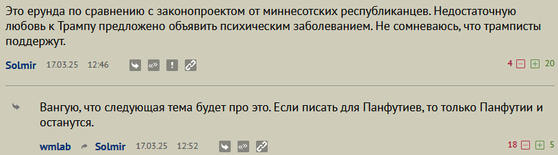 Собственно, я о чем? Появилась новая инициатива группы законодателей-республиканцев из Миннесоты, планирующих предложить законопроект, требующий от штата признать "синдром отвращения к Трампу" психическим заболеванием.
