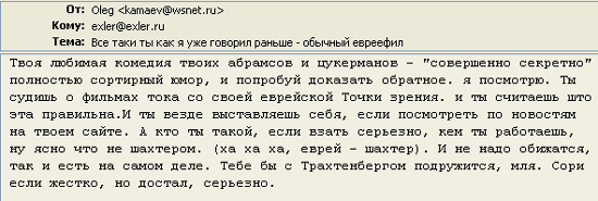 Стоило ли это выкладывать в блоге?... Никто не сомневается, Алекс, что такие письма к тебе приходят. Что качается "еврейского вопроса"(помимо прочего), то не дорос он ещё , чтобы судить по людям, а не по национальностям:) Что возвращает к вопросу - стоит ли выкладывать "детские" письма?:)