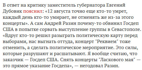 А Разин парень хитрожопый) Я и не знал что ласковый май еще выступает, и уж тем более не знал что у него концерт в Севатстополе. А стоило Разину упомнятуть про госдеп, так сразу засветился)