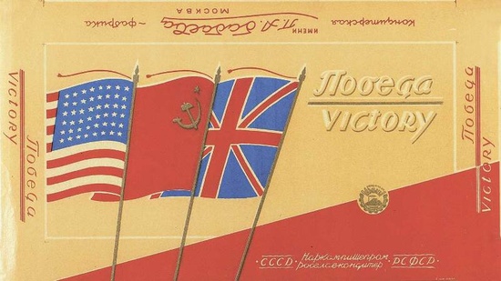 Коробка конфет "Победа" фабрики им. Бабаева. Наркомпищепром. Москва, 5-я литография МООМП, 1945.