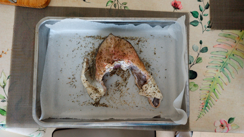 Довел до 50 градусов (даже при 180 в духовке на это потребовалось почти полчаса), достал, попробовал. Да, отлично - рыба получилась достаточно нежная и сочная. Намного лучше, чем я тогда наготовил на сковородке.