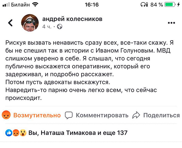 И дальше у них лишь два пути – либо садиться самим (попутно нанеся очередной мощный удар по "чести мундира" и дополнительно "раскачав лодку"), либо давить до последнего и всеми правдами-неправдами сажать Голунова (с привлечением всего пропагандонского админресурса)...