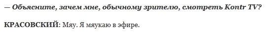 Персонажи по фамилии Минаев и Красовский на деньги прокремлевского фонда "Институт социально-экономических и политических исследований" сделали какой-то там канал Kontr TV. Ну, о качестве этого канальца сразу можно сразу судить по фамилиями персонажей: что Минаев, что Красовский - это диагноз. Но их интервью "Афише" можно почитать - с чисто клиническими задачами. Хотя диагноз там давно поставлен. Но зато прекрасный психологический портрет - такие пупсеги, это что-то!