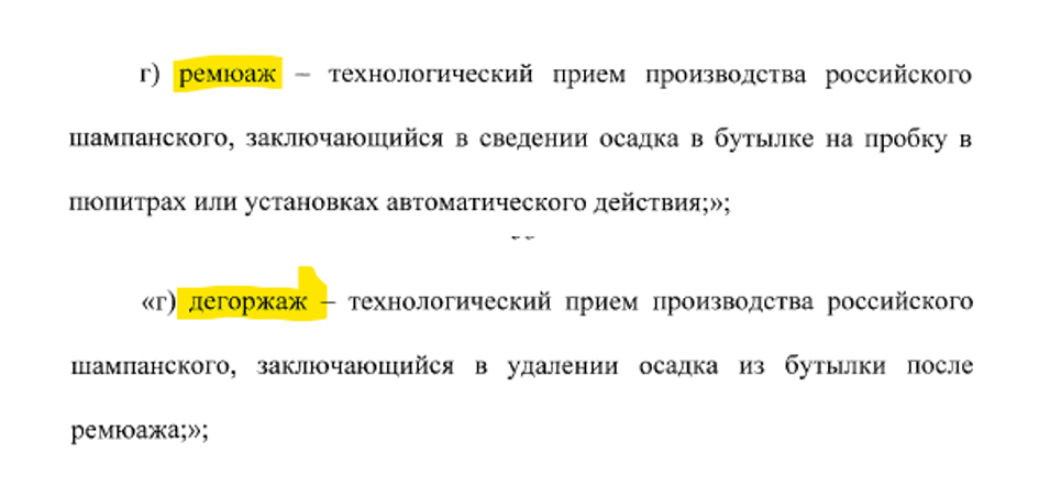 3. Внесли изменение в 489-ФЗ "«О виноградарстве и виноделии в Российской Федерации", где словосочетание "российское шампанское" осталось в рамках описания технологического процесса его производства, а именно тираж, ремюаж и так далее. Но так как в основном 171 ФЗ такой категории нет, то российское шампанское появиться не может, и это словосочетание используется исключительно внутри закона, а не как отдельная товарная категория. Скорее всего косяк МинЮста, который не заметил расхождение терминологии разных НПА, так как в каждом НПА термины определяются заново.