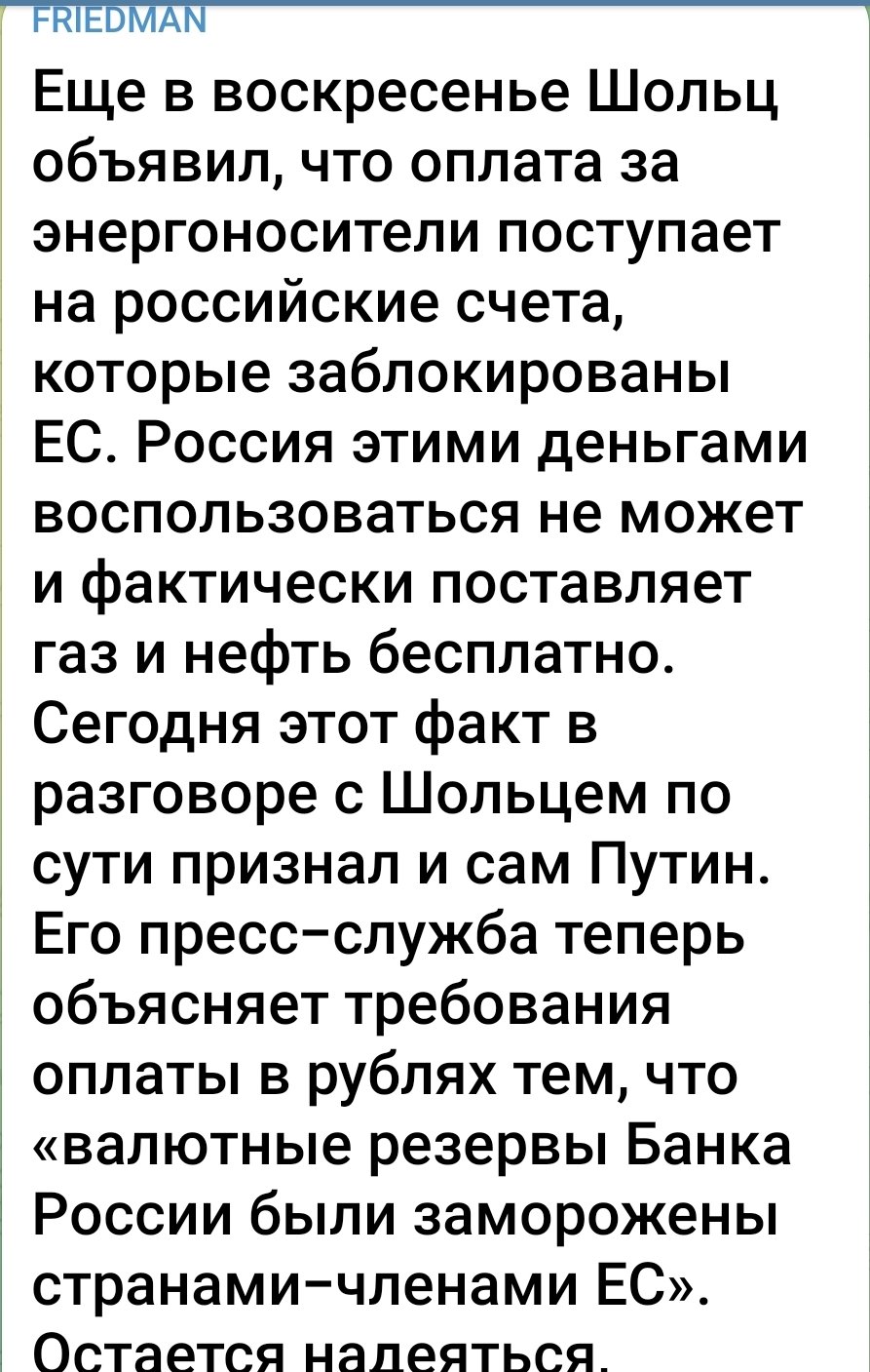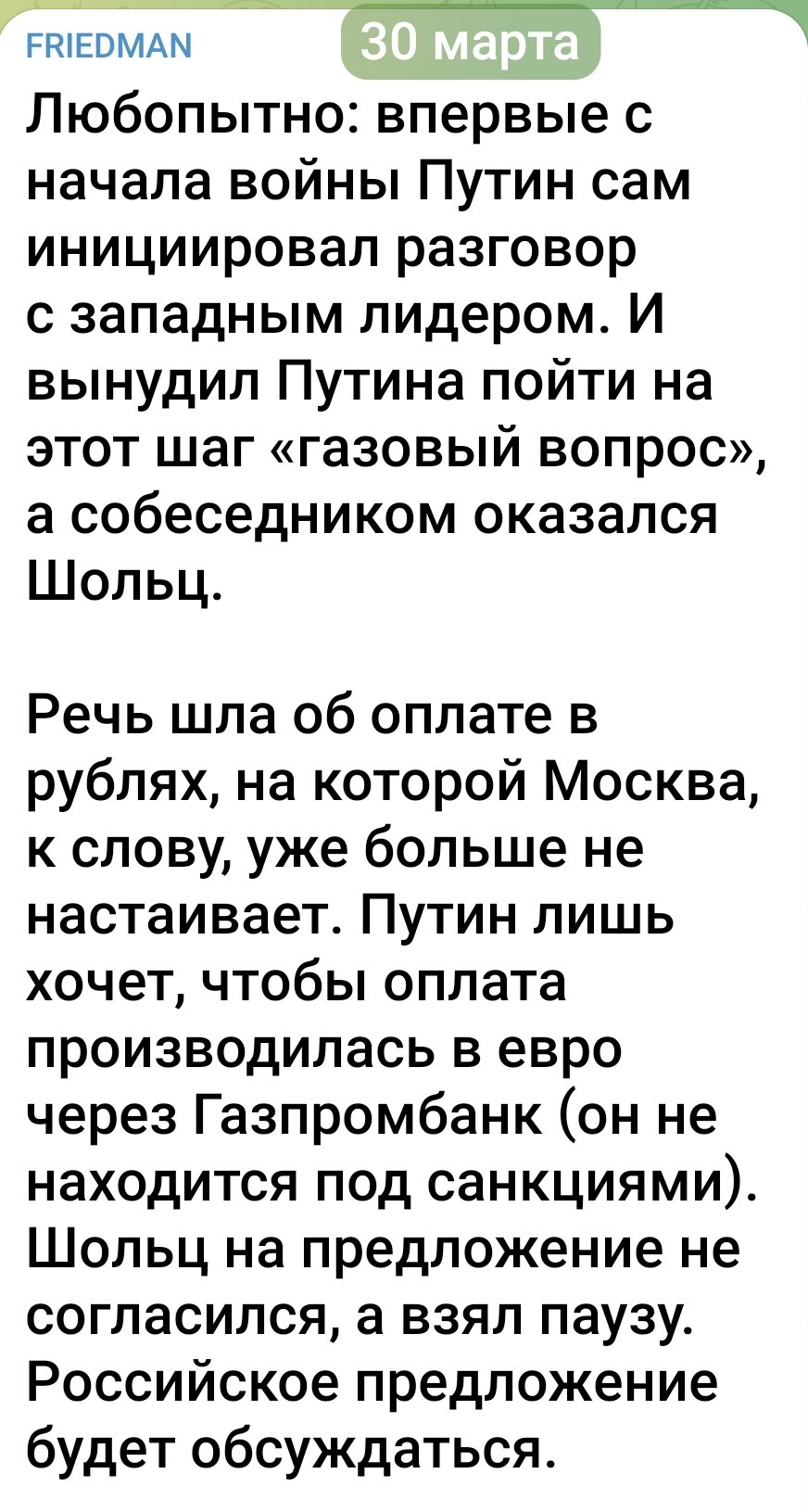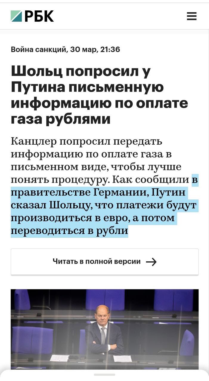 Пресс-секретарь германского правительства Штеффен Хебештрайт, как передает Франс пресс, излагает содержание разговора Шольц-Путин так - европейские страны в следующем месяце смогут продолжать платить в евро, как зафиксировано в контрактах. Платежи "будут продолжаться в евро и будут переводиться, как обычно, в Газпромбанк, который не затронут санкциями." А банк уже, как передает Хебештрайт слова Путина, переведет евро в рубли. (Отсюда.)