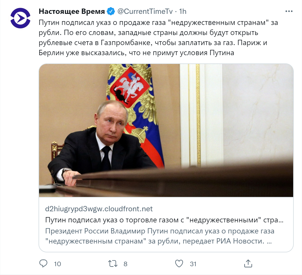 Президент Владимир Путин на прошлой неделе потребовал перевести в рубли расчеты за поставки российского газа недружественным странам. Его пресс-секретарь Дмитрий Песков объяснил, что в случае отказа платить за газ рублями бесплатных поставок газа не будет. Предлагаемую схему он описал: "Компании должны понимать, что просто надо купить за их валюту - евро, доллар - рубли и рублями оплатить газ". (Отсюда.)