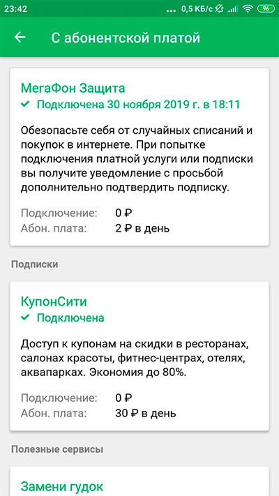 в феврале у ребенка на мегафоне появились платные подписки, оператор ничего про них сказать не смог, но бесплатно установили запрет подписок, так они потом на этот номер включили услугу доставки счета почтой 100 рублей в месяц. Сам я с мегафона ушел, надо выбрать время и ребенка тоже увести, все руки с паспортом не дойдут до салона)