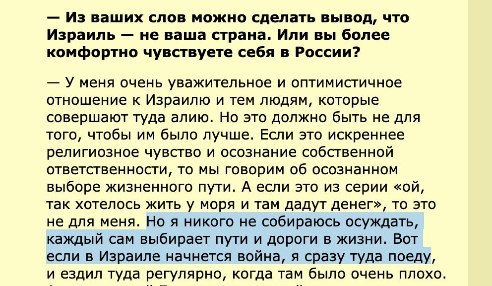 Этот человек - доктор! юридических! наук! Вначале он тезисно изложил мысль о том, что в 1947 году евреи забрали у арабского населения территории, потом спровоцировали ряд войн с целью захвата еще. Он ездил в Израиль и излечивал там свой рак. Знакомые в Израиле покупали по его запросу разные лекарства, которые недоступны в рф и присылали. Израиль его вылечил и теперь он пойдет читать лекцию и говорить о попрании Израилем норм международного права.