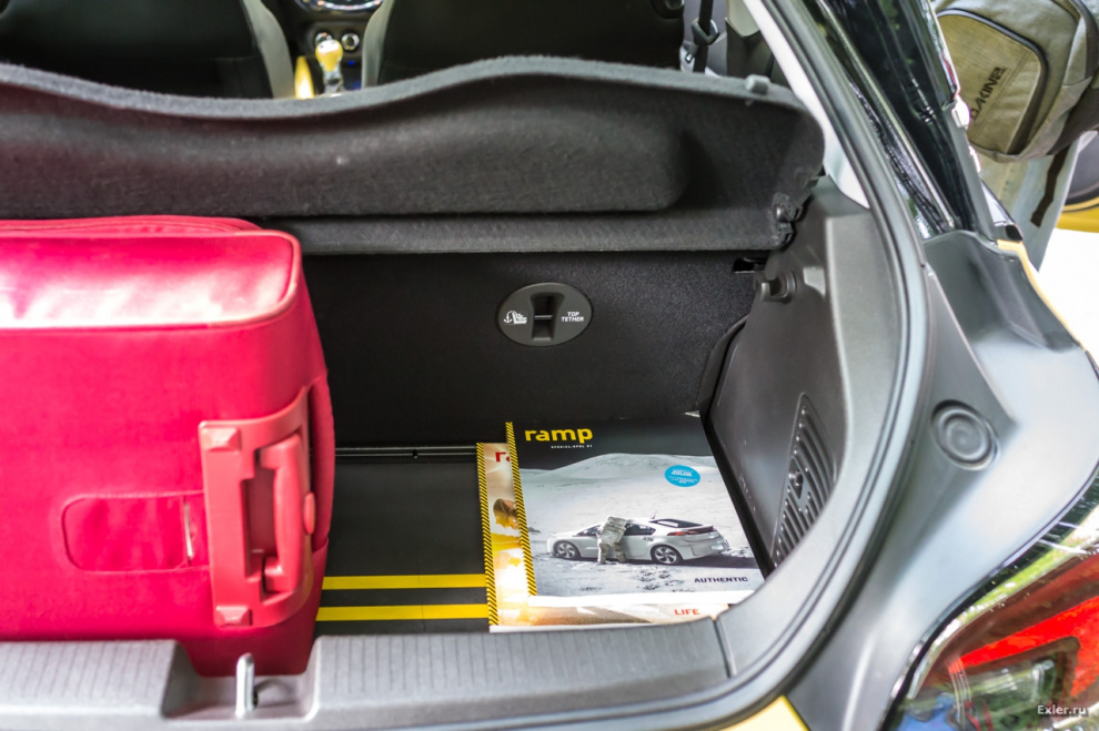 Багажничек у Adam - малюсенький, туда влез один-единственный салонный чемоданчик. Впрочем, для городской машинки обычно достаточно багажника, в который влезут сумки из магазина - они-то влезут без проблем. Кроме того, заднее сиденье откидывается - и тогда багажник становится довольно вместительным.