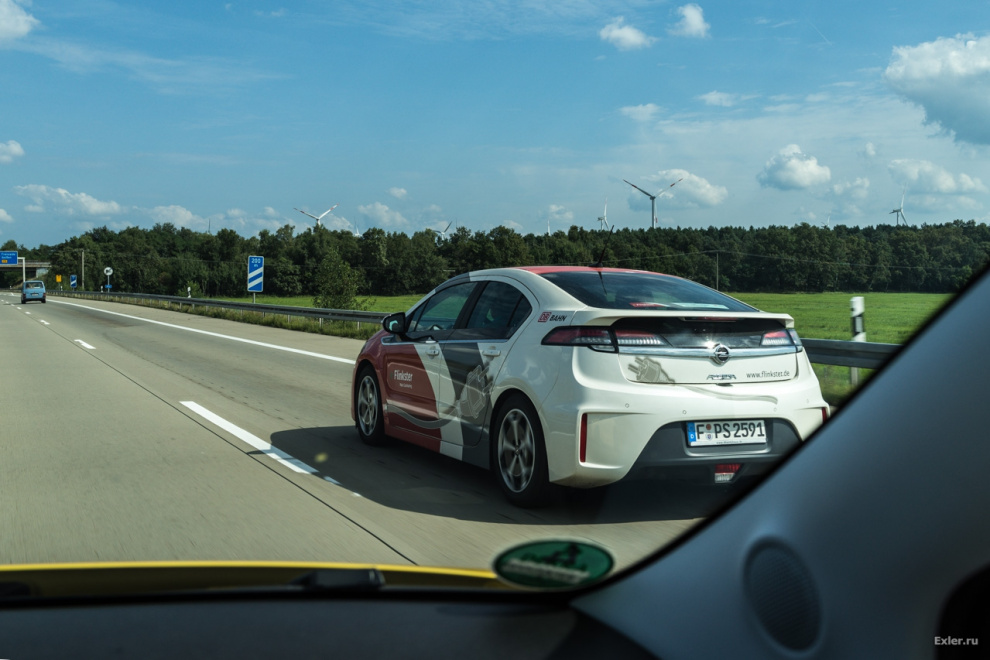 В процессе езды по трассе неожиданно наткнулись на очень экзотическую марку - Opel Ampera. Я ее вживую вижу в первый раз. Это последовательный гибрид с пробегом до 500 км. У него есть маленький бензиновый движок, но он используется только для работы генератора, который заряжает аккумуляторы. Любопытный автомобиль, надо будет как-нибудь на нем покататься.