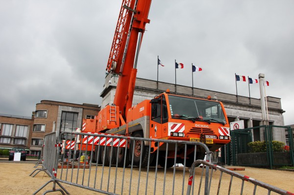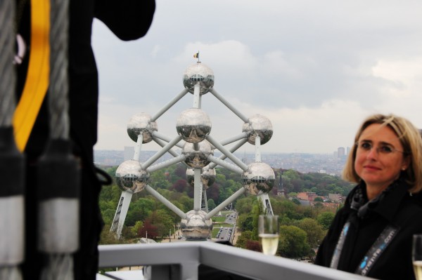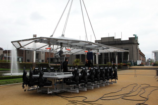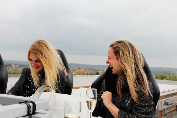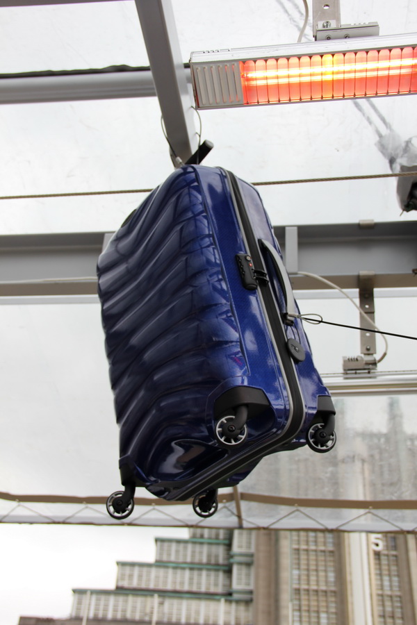 После презентации нас пригласили разделить полет в небо вместе с чемоданом Samsonite Firelite. Выглядело это все так. Платформа с креслами, подвешенная на стреле здоровенного крана.