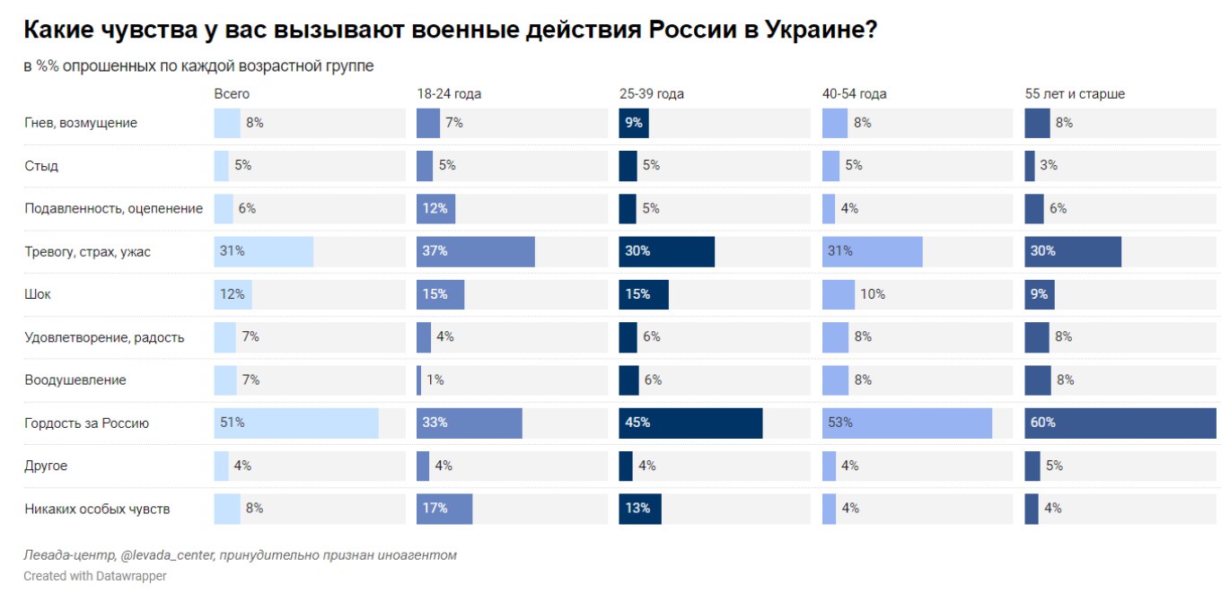 Понимаете, понятия "тревога, страх, ужас" (которые "Левада" почему-то стыдливо объединила в один пункт, не расшифровав их попунктно) – как-то вот явно мало совместимы с понятием "гордость за Россию".