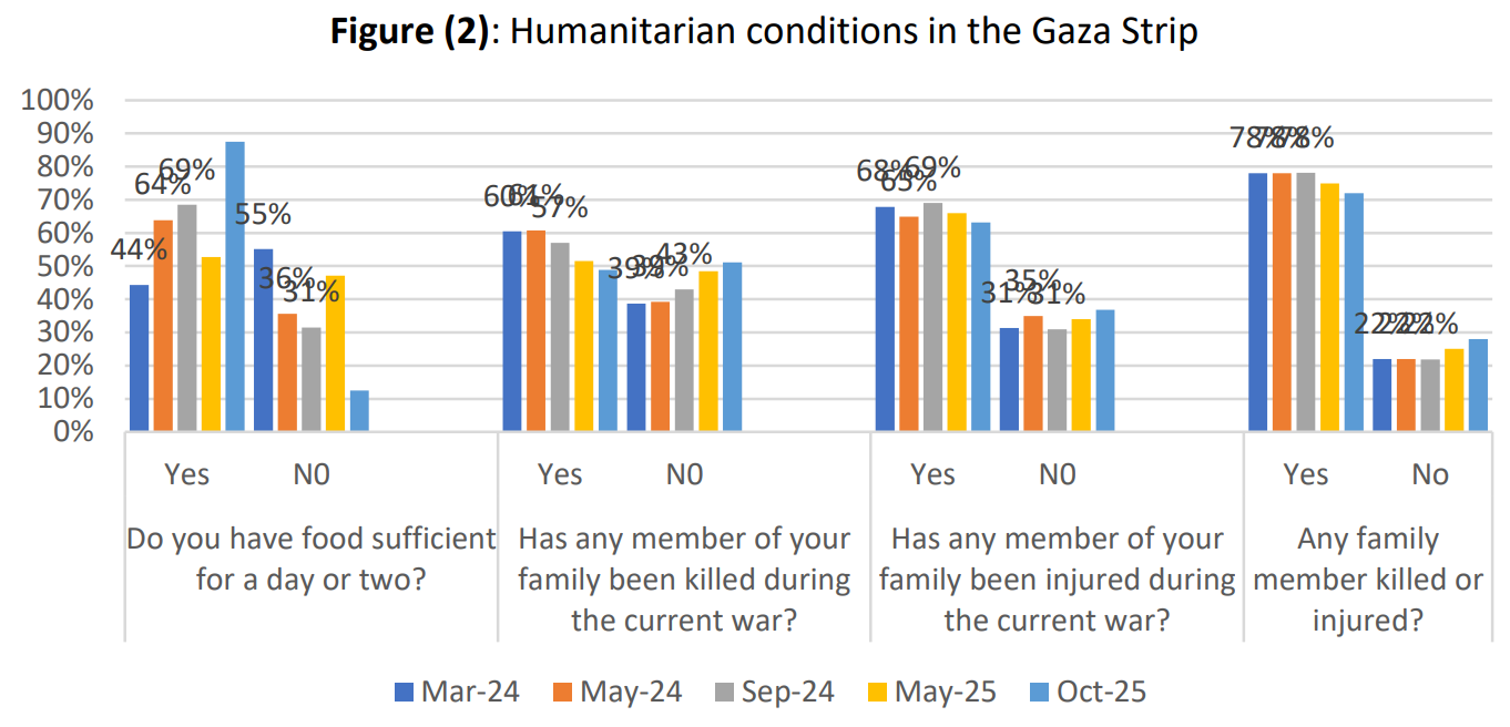 На вопрос о самой насущной проблеме, с которой сегодня сталкиваются палестинцы, наибольший процент (43%; 46% в секторе Газа и 40% на Западном берегу) ответил, что это израильская оккупация; 22% сказали, что это продолжающаяся война в секторе Газа; 12% сказали, что это нападения поселенцев на Западном берегу; 12% сказали, что это коррупция; и 8% сказали, что это безработица.