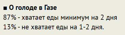 - про 87% - хватает еды _минимум на 2 дня_. В отчете не так: 87% of Gazans say they have enough food for a day or two - 87% говорят, что еды хватает на день-два. Почувствуйте разницу.