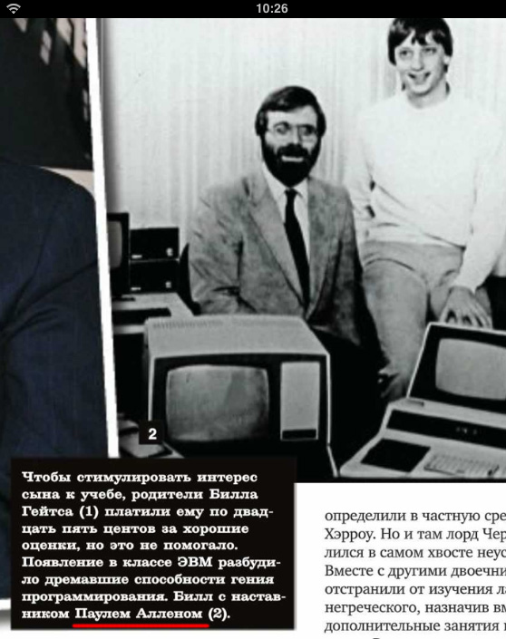 И с чего Аллен вдруг стал "наставником" Гейтса, когда они были просто школьные друганы, вместе увлекались компьютерами и вместе основали фирму Microsoft (собственно, фотка уже, похоже, раннемайкрософтовских времен)? Инне Локтевой эти подробности совершенно неизвестны, а выяснять - лень, поэтому она увидела на фотке худосочного Гейтса и какого-то бородача, который выглядит заметно старше (в действительности у них разница - два года), поэтому и написала, что это, мол, наставник юного Гейтса. Учитель информатики Пауль Айкляйн - надо было так написать.