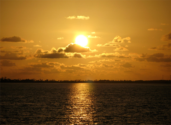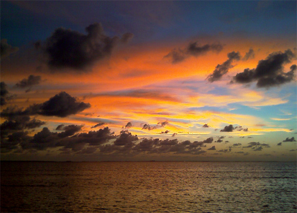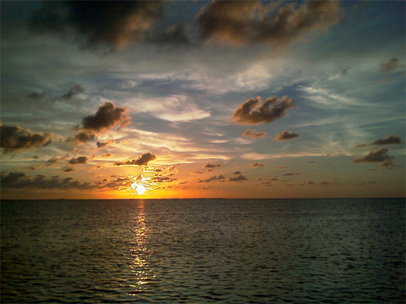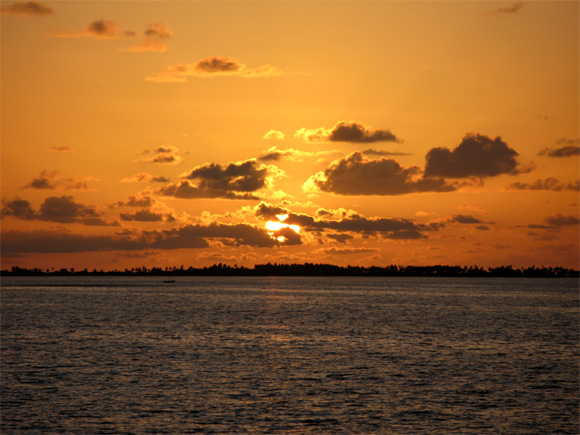 Здесь, на экваторе, очень странное ощущение на закате. Если сидишь на открытом пространстве (а тут на острове есть один бар с большой открытой террасой, выходящей прямо к океану), то возникает ощущение, что находильшся прямо в центре огромной сферы, верхняя часть которой представляет собой небо с облаками. То есть горизонт слева и справа как бы заворачивается к линии острова. Этому ощущению также способствуют очень низко висящие облачка, до которых кажется рукой подать. Поэтому когда закат - картина совершенно демоническая.