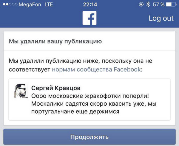 Otiz: Добавил бы "смерть пиндосам и сионистам", тогда бы не забанили из соображений политкорретности. В Фэйсбуке миллион страниц с такими призывами, никто их не трогает (нервным не смотреть)