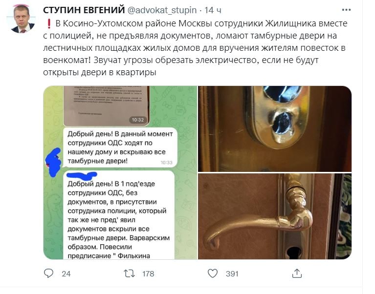 Сотрудники полиции и жилищно-коммунальных организаций начали взламывать двери военнобязанных для вручения повесток, сообщает депутат Мосгордумы Евгений Ступин. По его словам, такое произошло в Косино-Ухтомском районе Москвы.