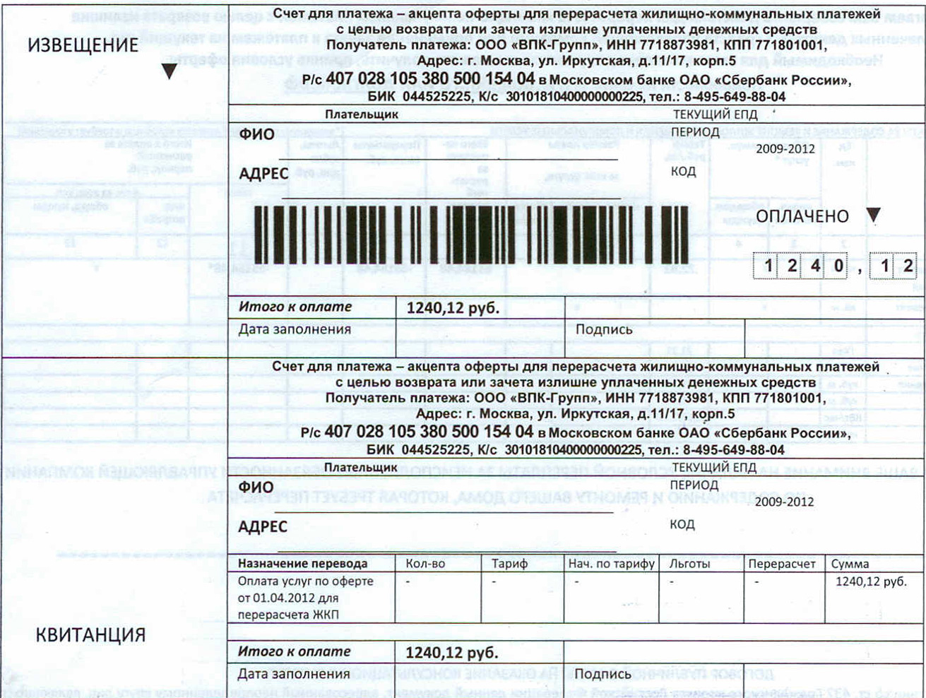 Очень похоже на обычную бумажку перерасчета услуг ЖКХ, не так ли? Только если приглядеться, то там написано "оплата УСЛУГ ПО ОФЕРТЕ для перерасчета ЖКП". То есть вы платите 1240 рублей за то, что какая-то "ВПК-Групп" окажет вам услуги по перерасчету ваших платежей. После оплаты они вам пришлют некие бумажки, не сомневайтесь. И предъявить к ним претензии - невозможно, там все четко написано, а на обратной стороне бумажки идет большой текст оферты. А если какие-то пенсионеры сослепу примут эту бумажку за долг после перерасчета и оплатит - ну так ничего страшного, им за 1240,12 рублей пришлют какие-то бумажки, где что-то куда-то перерасчитают. Управляющая компания ЖКХ потом объяснит, что можно сделать с этими бумажками. Жаль, что 1240 рублей при этом уже не вернуть.