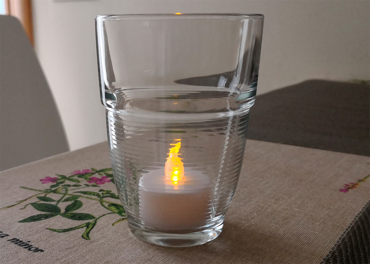 Теперь для них прикупить небольшие стеклянные сосудики различных цветов - будет то, что надо. Но и даже в стакане смотрится прилично. Пламя имитирует отлично - дрожит, переливается и все такое.