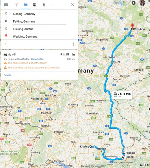 Страшно подумать о тех, кто решил из Kissing зарулить сперва в Wedding, и только потом в Fucking. Это ж какой крюк выходит!