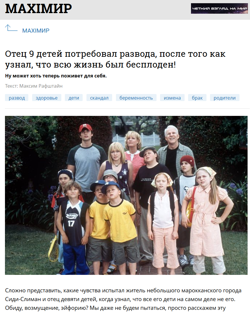 В журнале "Максим" опубликовали заметку о марокканце, у которого было 9 детей и который в пятьдесят с лишним лет узнал, что он - бесплоден. Заметка проиллюстрирована фотографией счастливой семьи марокканца, сделанной еще в те времена, когда он не знал, что бесплоден. В ту счастливую пору марокканца звали Стив Мартин, да и детей у него было не 9, а 11.