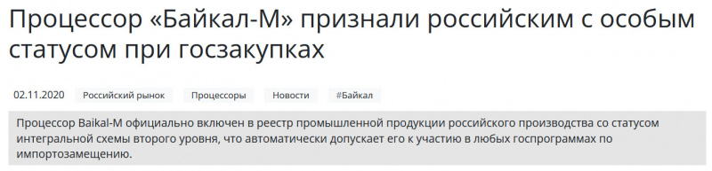 госструктур. Просто с мертворожденного Байкала-Т на MIPS-е перешли на полумертвый Байкал-М на ARM, еще планировали серверный Байкал-S, тоже на ARM, но тут как раз TSMC что-либо производить отказалась.
