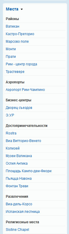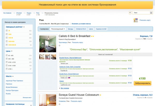 Очень интересный вариант фильтра - по туристическим регионам, округам, достопримечательностям, развлекательным центрам и религиозным местам. Например, вам нужен отель именно у вокзала Термини или в прекрасном Трастевере.