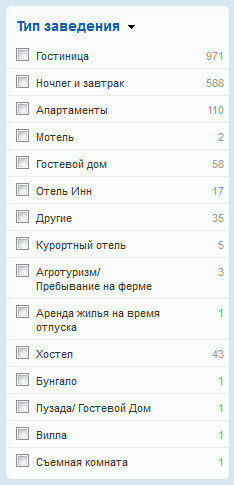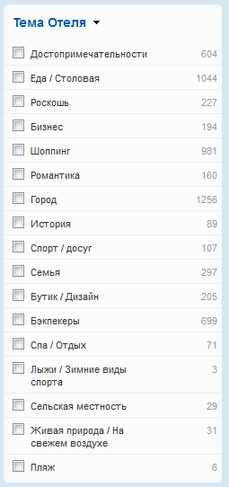 Отбор с указанием видов услуг (Интернет, бассейн, парковка) - конечно, есть, но это обычный вид фильтрации, а вот что необычно - фильтрация по теме отеля.
