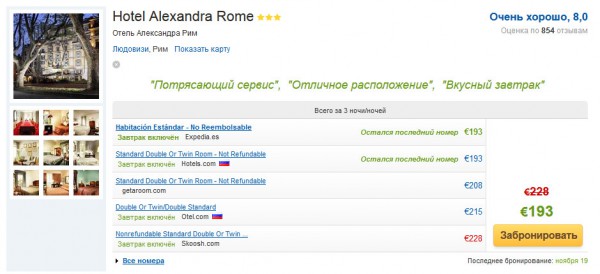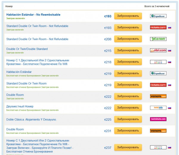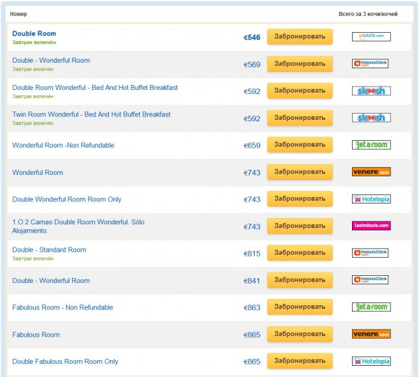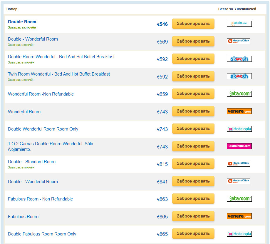 Нажали "Забронировать" - перед вами появляется список лучших (выгодных) предложений. Далее остается выбрать самое интересное предложение и нажать кнопку - вы будете перенаправлены на соответствующий сайт для завершения бронирования.