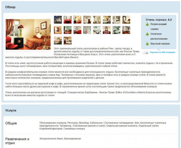 По каждому отелю выдается масса всевозможной справочной информации: фотографии, описание, сервисы, оценки гостей, виды номеров и цены на них.