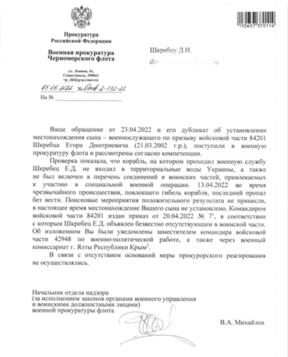 Я уже писал о Дмитрии Шкребце - отце срочника, погибшего на крейсере "Москва", и о том, какой ответ он получил от военной прокуратуры в ответ на свой вопрос.