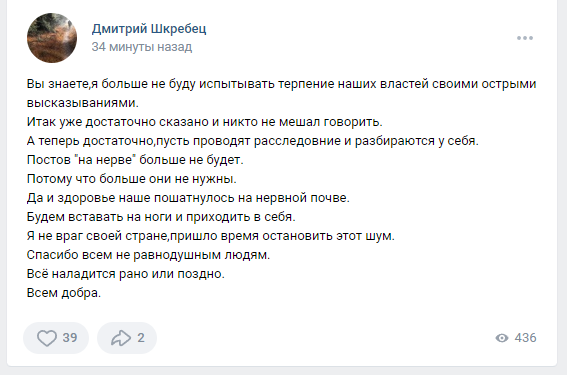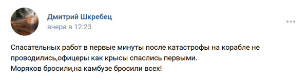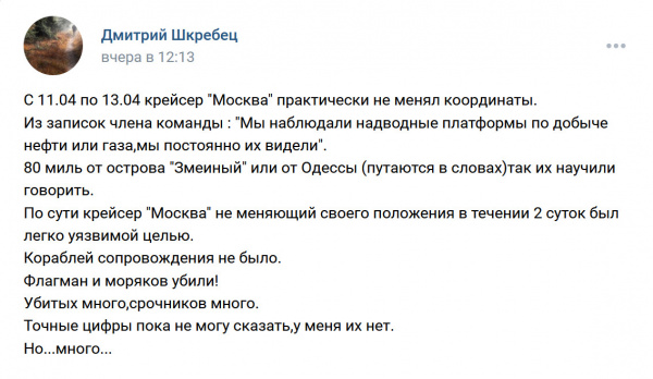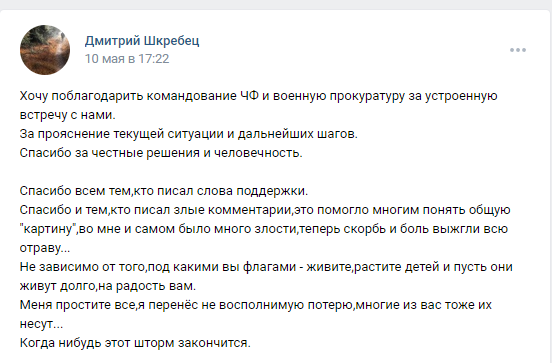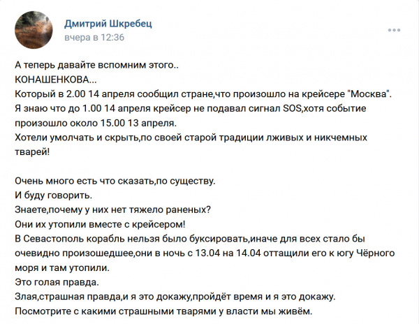 Дмитрий продолжает вести свою страницу во Вконтакте, где достаточно жестко высказывается на всякие темы, связанные с гибелью крейсера и гибелью моряков, бывших на нем, а также временами "возносит хулу" на высших должностных российских лиц, включая даже, страшно сказать, самого Обнуленного. Похоже, что Дмитрию просто нечего больше терять. При этом, что характерно, судя по его странице, раньше Дмитрий был пламенный патриот и запутинец.