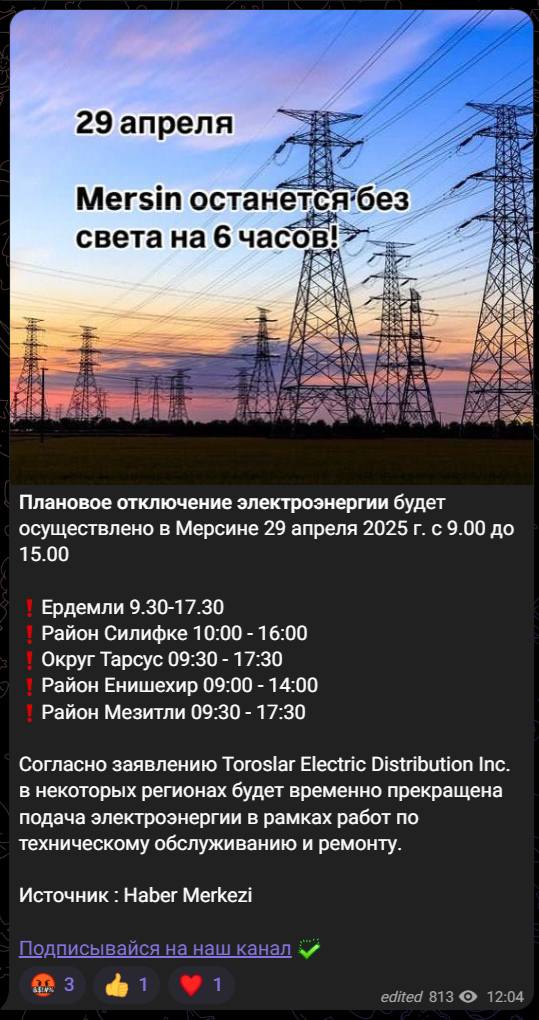 Здесь, если планируют работы с отключением электроэнергии, то по улице сначала приезжают машины-генераторы, их ставят возле каждой трансформаторной подстанции. Потом, на 3-5 минут отключают электричество и за это время переключают подачу на генераторы.