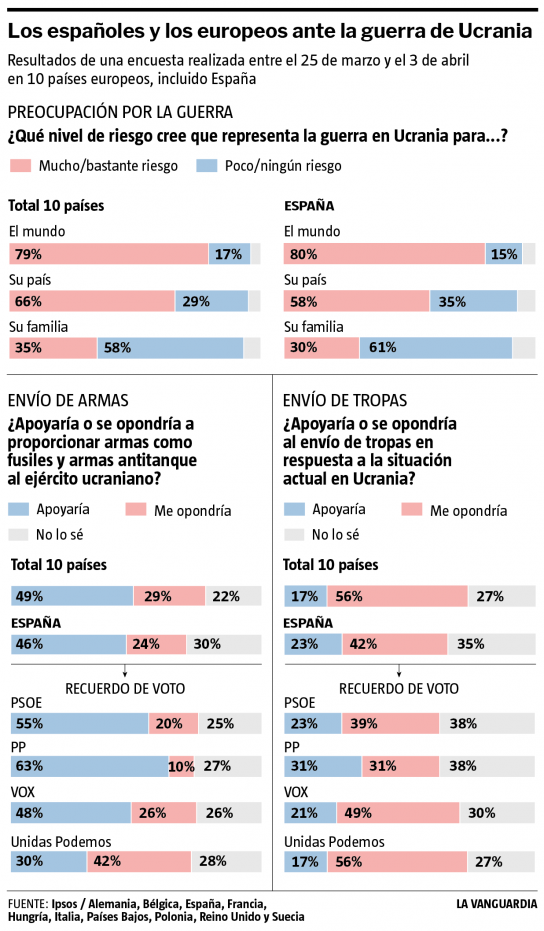 Испания входит в число стран, где меньше всего людей против отправки войск в Украину и больше всего людей, поддерживающих прием беженцев, спасающихся от войны, развязанной после российского вторжения. Это отражено в опросе Ipsos, проведенном в 10 европейских странах, включая Германию, Францию, Италию и Великобританию, на выборке из 10 000 интервью, проведенных в период с 25 марта по 3 апреля. В частности, если почти 60% европейцев были бы против отправки войск в Украину для разрешения конфликта, в котором военная составляющая становится все более решающей, то среди испанцев этот отказ падает до 42% (вместе с 35% тех, кто не стал отвечать на вопрос).