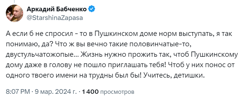 З.Ы. Госпожа Рубина в своей пламенной речи избегла упоминания о носителях пушкинского языка, которые совершали преступления в Буче, Изюме, Мариуполе и пр.