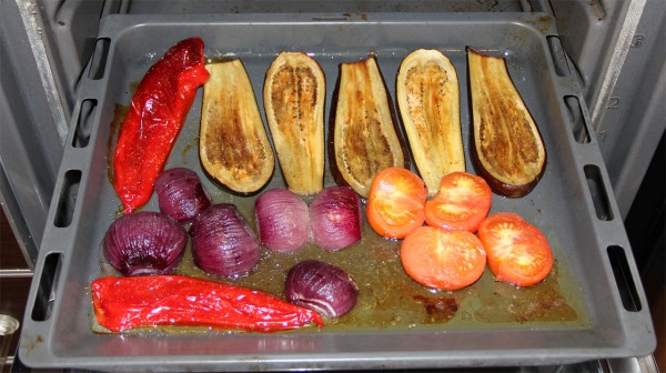 На прогретый (160 градусов в духовке) противень выкладываются: целиком длинные перцы (испанские, турецкие, но не толстые болгарские), длинные дольки баклажанов (можно даже половинки), половинки красного лука (можно обычного, но красный - вкуснее), ну и можно половинки помидоров. Самая тут вкуснота по убыванию: перцы (их лучше больше всего), лук, баклажаны. Остальное все вторично.