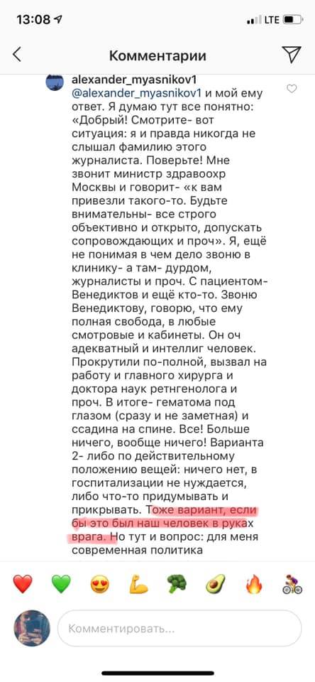Весь этот его пост - жалкая попытка оправдания. Потому что если допустить , что вчерашнее заключение о состояние здоровья ИГ верное, то зачем столько букв.? Просто достаточно написать - гематома и синяк - добавить нечего. Вот исследования, вот заключение. Так ответил любой доктор при условии верного диагноза . А тут прям история, про любовь к Родине.