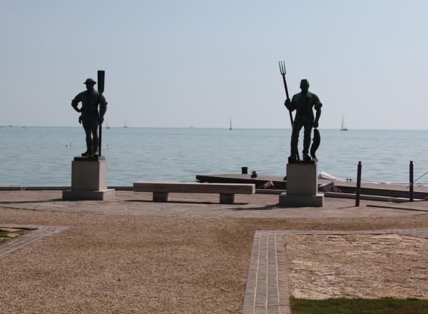 В начале набережной установлен памятник двум главным местным трудовым профессиям: моряку и изготовителю палинки, венгерской водки.