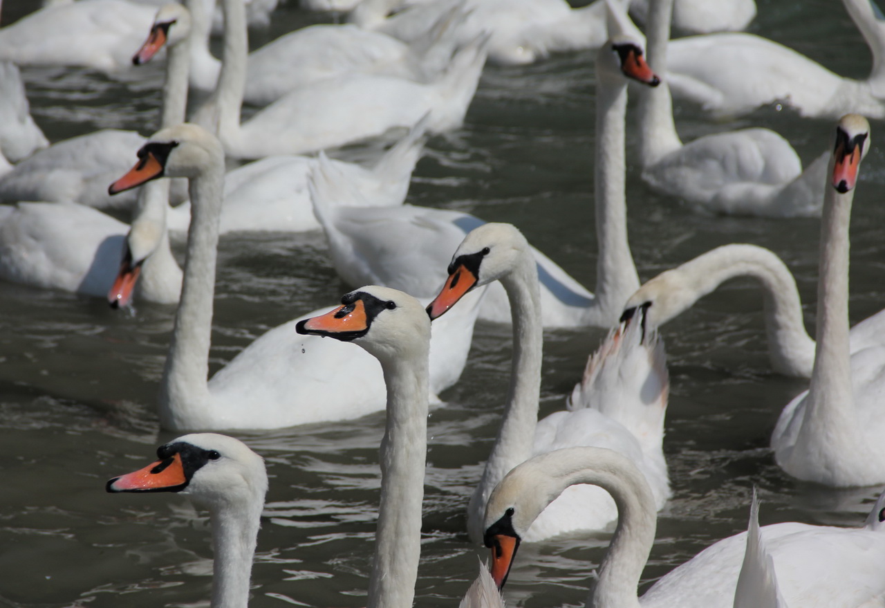 По озеру плавают лебеди. Если провести магический ритуал - встать у воды и начать кидать в воду хлеб - лебедей сразу становится очень много.