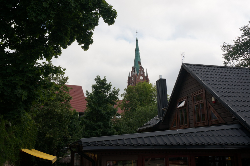 Костел со знаменитыми часами: днем у них циферблат белый, как легко видеть на снимке, а ночью он черный. Фокус объясняется просто: циферблат сделан из отполированного металла. Днем в нем отражается небо, поэтому циферблат кажется светлым.