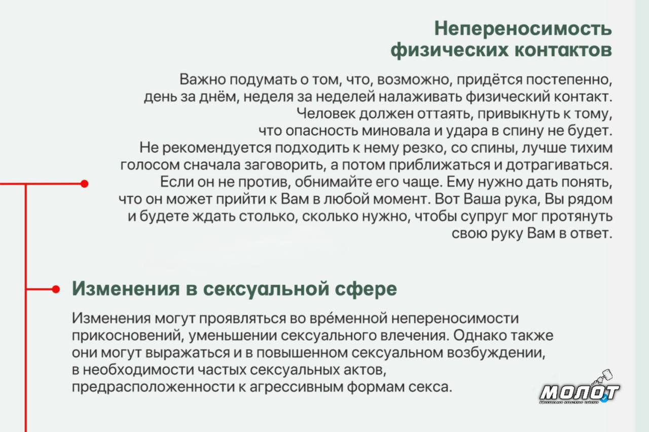 Три российские автономные некоммерческие организации — «Ценим Жизнь», «Соратник» и «ГаГаРа» — подготовили памятку с советами для жен участников специальной военной операции на Украине. Пока документ в онлайн-формате распространяют через благотворительные организации в Татарстане и Челябинской области, а печатные версии раздают солдатам в зоне боевых действий и продвигают через республиканскую психиатрическую больницу в Татарстане.